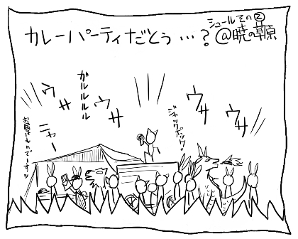 前日に『彼女』ことラクリモーサさんが急展開を迎えた事を知り。 おっと!?カレー作る張本人が…!と慌てる背後は置き去りに もちろんそんな事は露知らない『なんでも屋』はただただ以前レミちゃんに ご馳走になった夕ご飯+酒代分の借りを返さんと向かった訳ですが。 カオス……! 予想外でした。レミちゃん、流石ですッ! もう面白いくらいに色々とカレーに飛び込んで行って。 ウサ耳だの、ネコ耳だの、果ては狼男まで。 ――もはや、はたから見て誰もカレーパーティとは思うまい。 とても楽しかったです。 |
